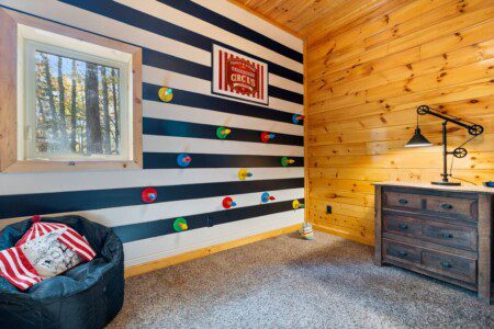 Bedroom 4 (Circus Room) → Queen-Over-Queen Bunk + Ring Toss Game + Shared Full Bath Access (4 guests)