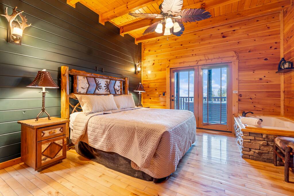 Bedroom 1 → King Size Bed + Jetted Tub + Smart TV + Ensuite Full Bath + Deck Access (2 guests)